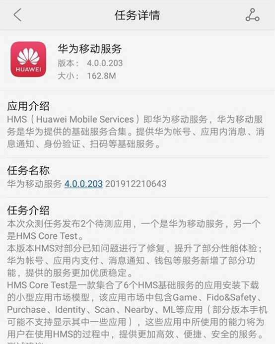 據(jù)了解,本次眾測任務(wù)發(fā)布2個(gè)待測應(yīng)用,一個(gè)是華為移動(dòng)服務(wù),另一個(gè)是HMSCoreTest,該版本HMS對(duì)部分已知問題進(jìn)行了修復(fù),提升了部分性能體驗(yàn);華為賬號(hào)、應(yīng)用內(nèi)支付、消息通知、錢包等服務(wù)新增了部分功能,提供的服務(wù)更加優(yōu)質(zhì)穩(wěn)定。