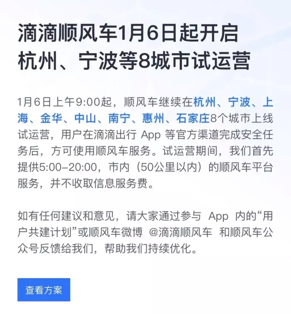 試運(yùn)營(yíng)期間,滴滴首先提供5:00-20:00,市內(nèi)(50公里以內(nèi))的順風(fēng)車平臺(tái)服務(wù),并不收取信息服務(wù)費(fèi)。