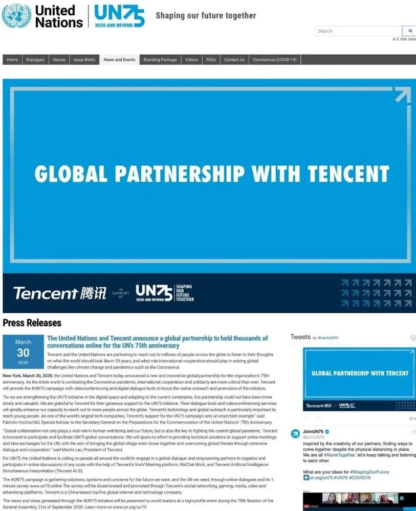 3月31日,聯(lián)合國在紐約總部宣布:和騰訊達(dá)成全球合作伙伴關(guān)系。