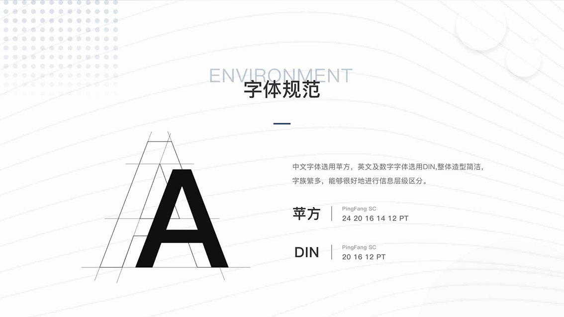 在本次設計風格中,我們中文字體選用蘋方,英文及數(shù)字字體選用DIN,整體造型簡潔字族繁多,能夠很好地進行信息層級區(qū)分。顏色采用藍、橙、粉、白四色,彰顯活力,也不失典雅韻味。